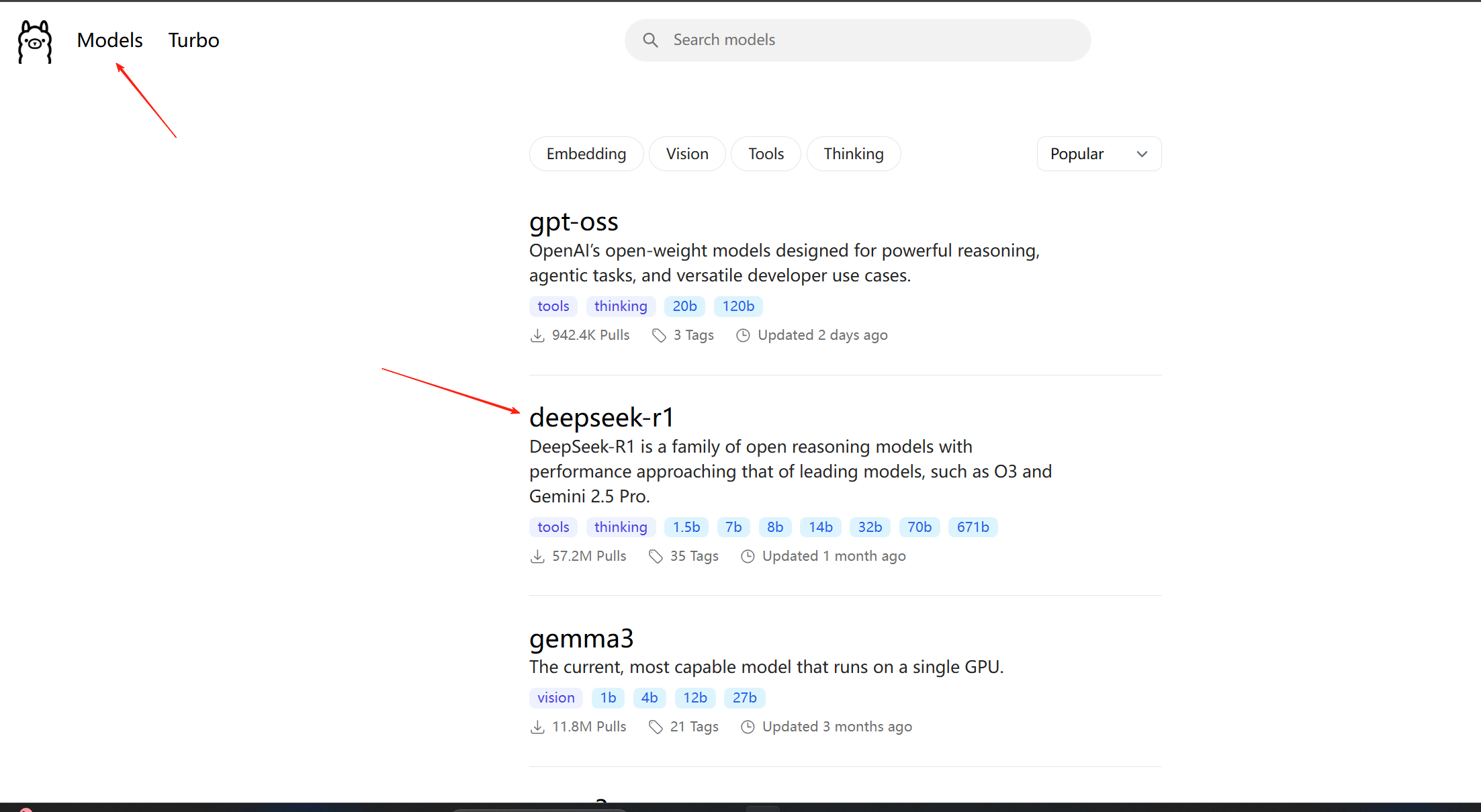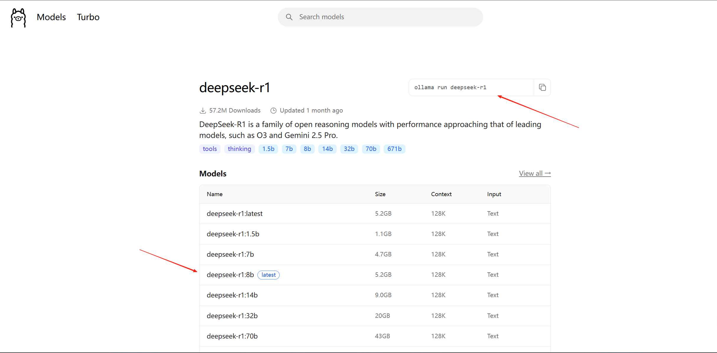 在ollama官网的Models标签找到想要下载到本地的大模型,选择对应的模型参数,直接复制指令到终端下载即可: